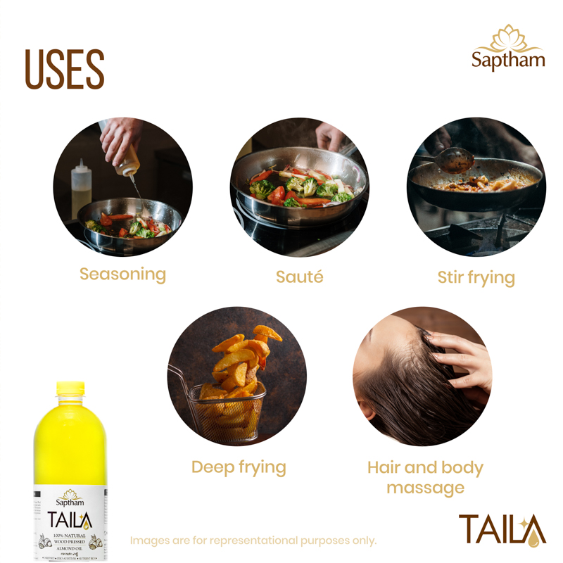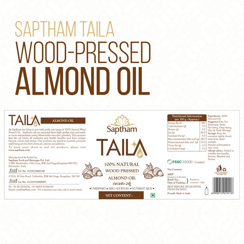 - Fusion of TRADITION, TECHNOLOGY and INNOVATION – TAILA is an exclusive edible and essential oil brand of Saptham Food and Beverages – world’s first wood pressed oil company to receive FSSC 22000 certification.