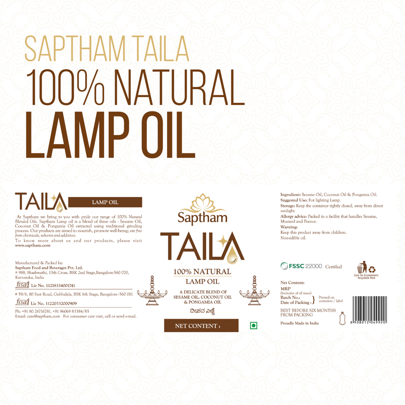 • Designed in consultation with Vastu and Astrology expert, Saptham Lamp Oil is a blend of 3 oils - cold pressed Coconut Oil, cold pressed Sesame Oil and Pongamia Oil.
