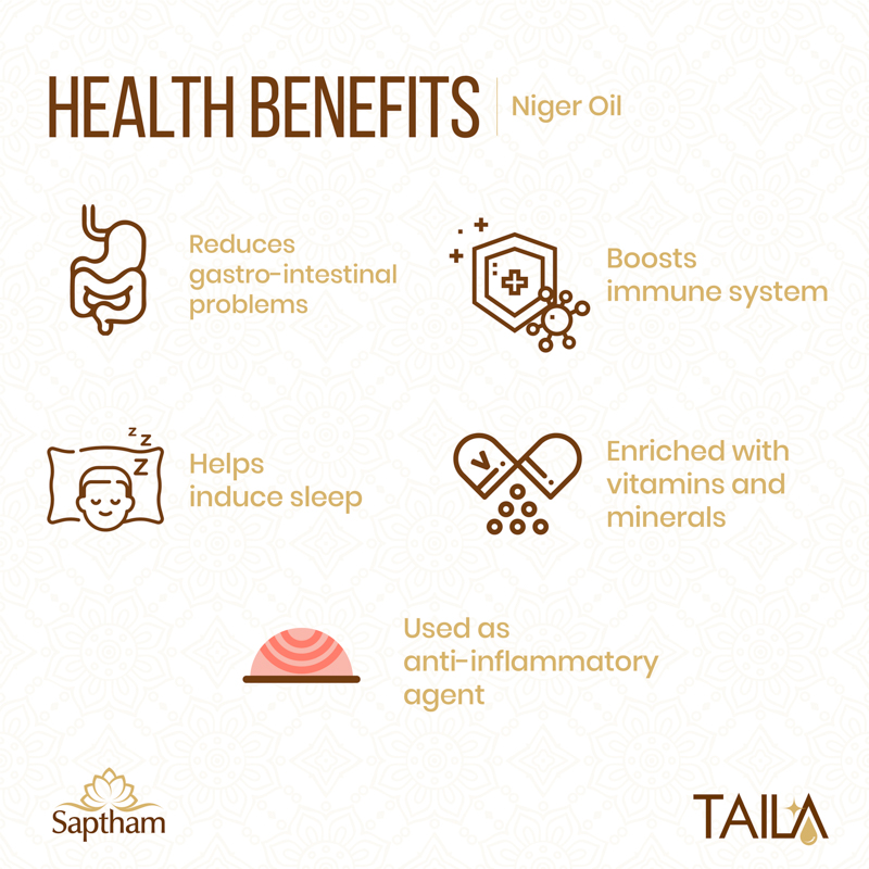 - Cold Pressed Niger Oil is abundant in Omega-3 and Omega-6 fatty acids which are known to balance cholesterol levels.